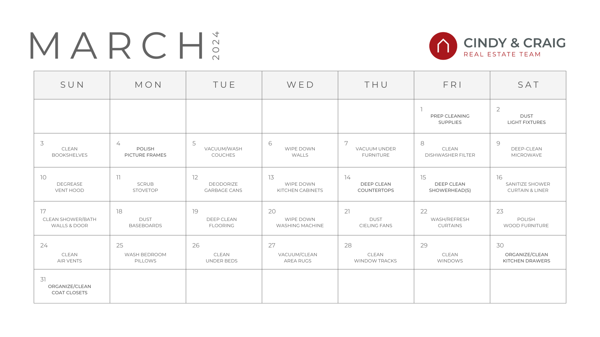 When it comes to spring cleaning, the trick is to avoid taking on too much at once. Some of these tasks seem easier and/or faster than others, but stick to it to ensure nothing gets skipped and you don't run out of steam along the way. If you participate in our challenge, tag us @cindyandcraig so we can follow along!