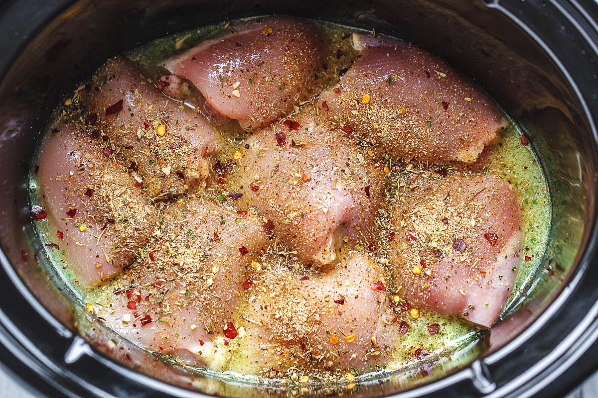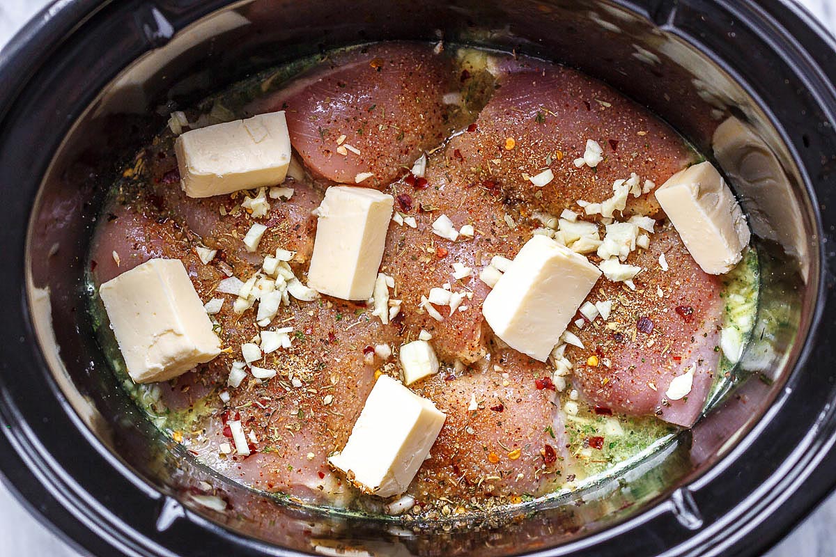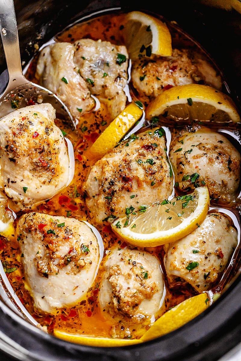 1. Place chicken thighs at the bottom of your slow cooker. Combine 1/3 cup chicken broth, lemon juice and zest, and pour over chicken thighs. In a small bowl, combine Italian seasoning, onion powder, garlic powder, paprika, red chili pepper flakes, salt and pepper. Psirnkle the spice mix over the chicken thighs. Top with fresh, minced garlic and diced butter.