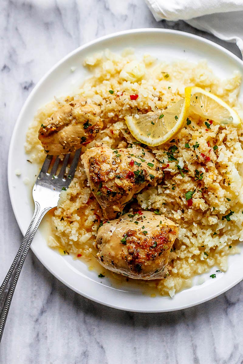 3. Sprinkle your chicken with chopped parsley and garlish with lemon slices. Serve hot with cauliflower rice, spiralized zucchini noodes, rice, pasts or quinoa. Enjoy!