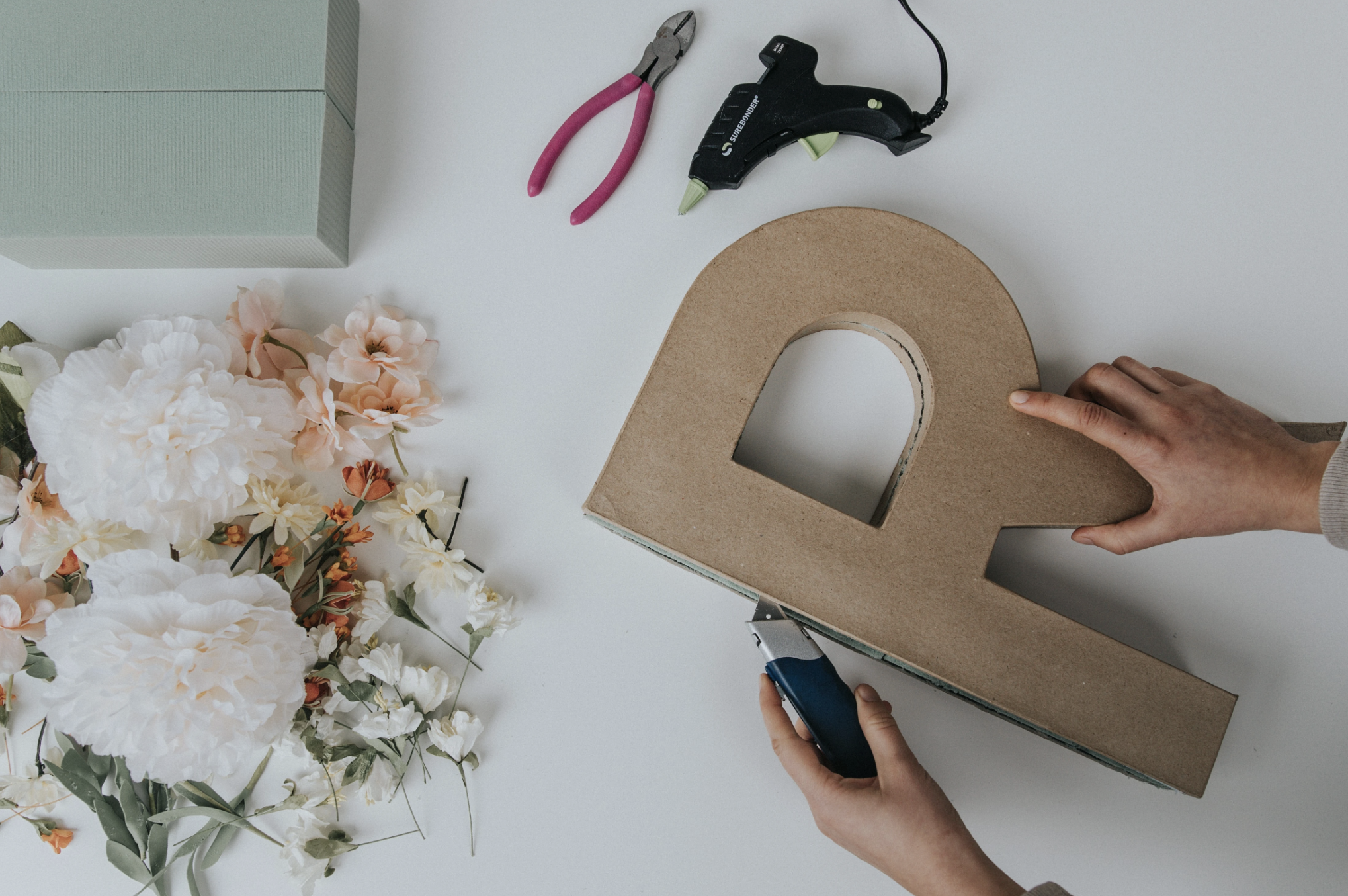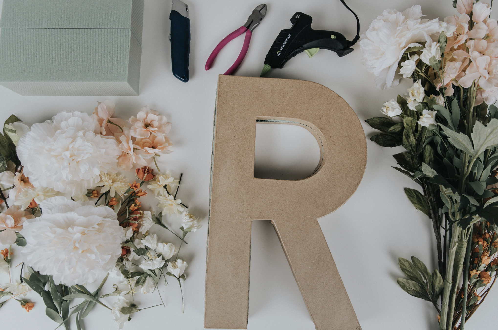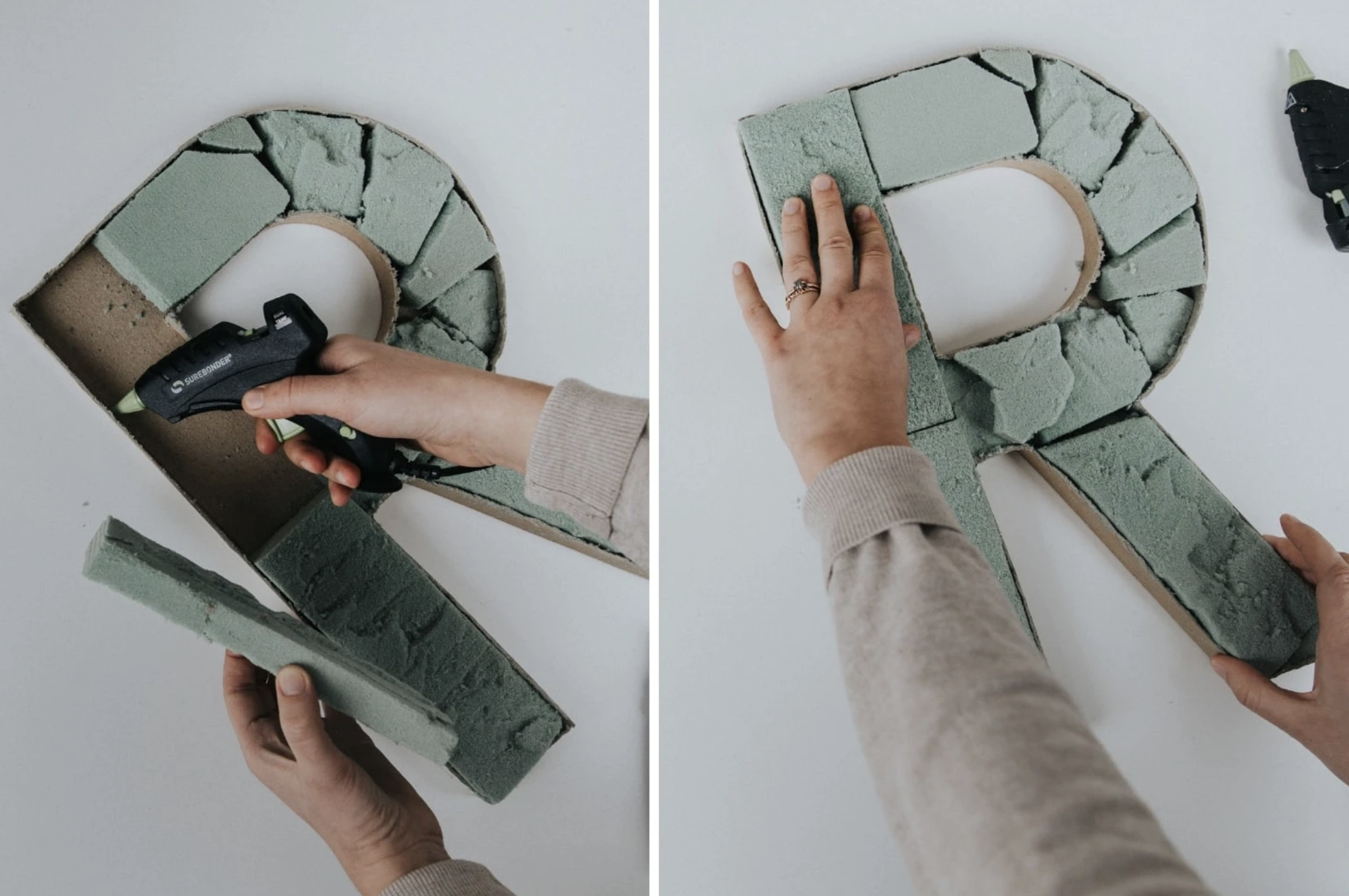Cut floral foam to fit inside the paper mache letter. It doesn’t need to be pretty, as it will be covered with flowers! Hot glue the floral foam in place.