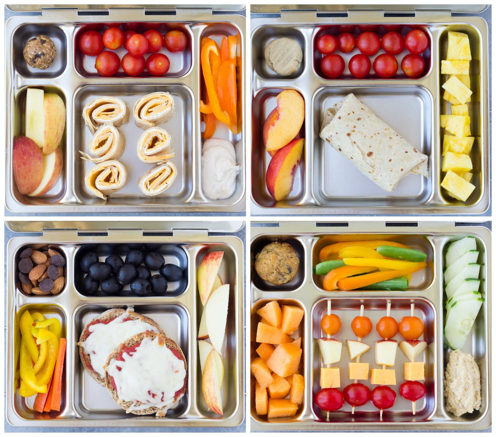 1. Cheese roll ups (whole grain tortilla, cream cheese, cheddar cheese slices), apple slices, peanut butter chocolate chip energy bite, cherry tomatoes, bell peppers and white bean dip. (Top Left)