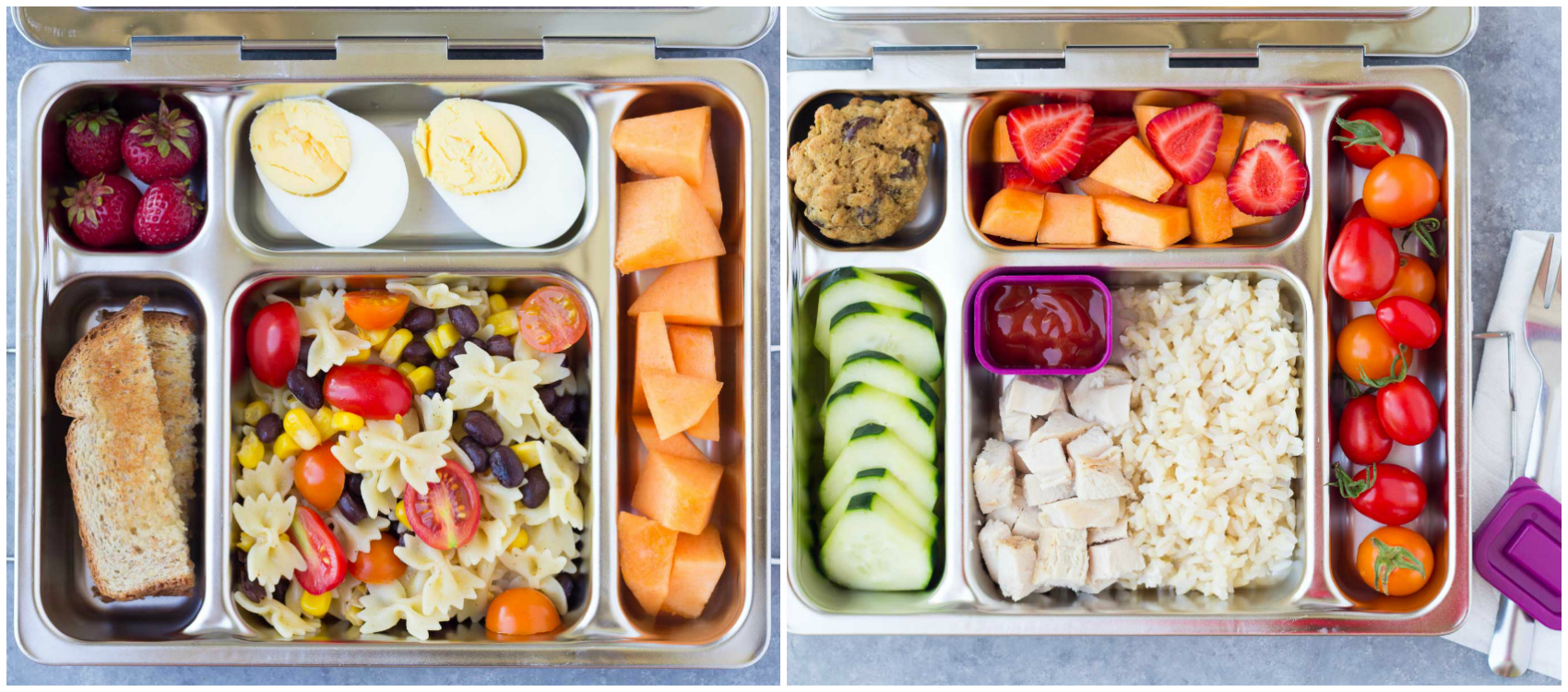 1. Quick pasta salad (4 cups cooked mini farfalle pasta tossed with a mixture of 1 tablespoon olive oil, 1 tablespoon lime juice, 1 teaspoon honey, and 1/4 teaspoon mild chili powder. Add 1 cup each of canned corn, black beans, and halved cherry tomatoes.), whole wheat toast sticks with butter, strawberries, hard boiled egg, cantaloupe.
