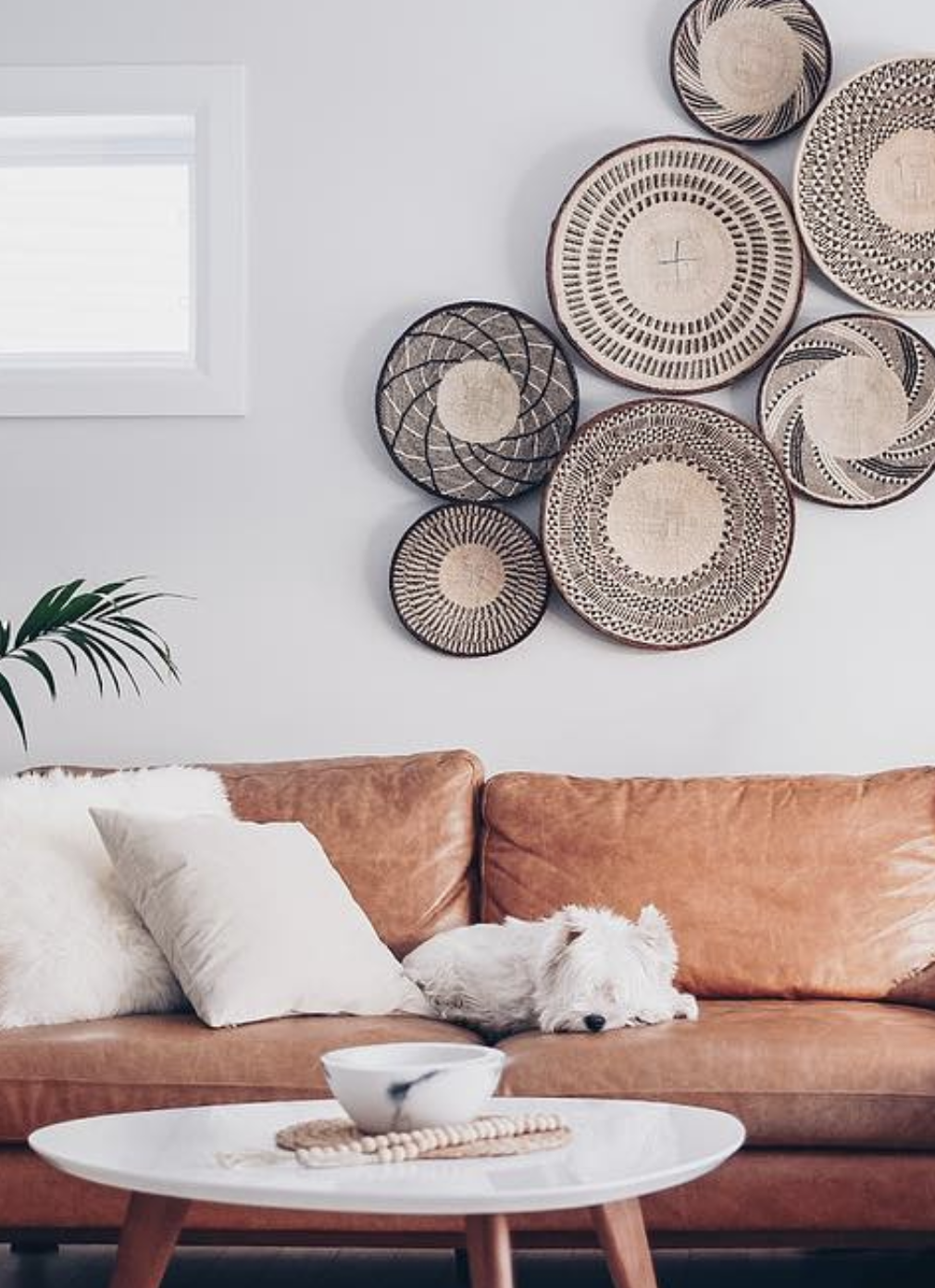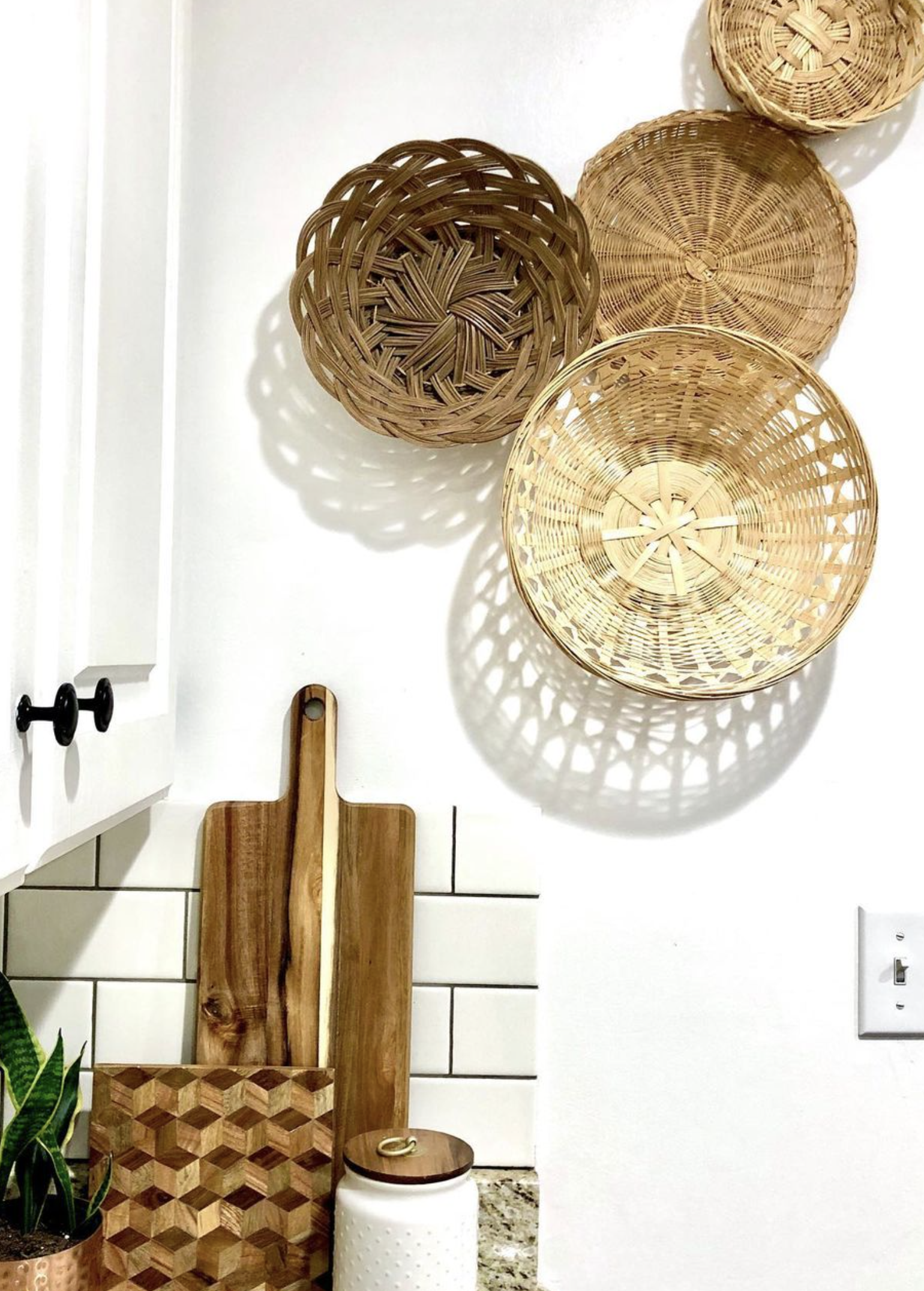 Check out the inspo for the bohemian inspired trends of using wicker or grass baskets to add some interest for a blank wall. These sets are available at many home decor stores but you can also try thrift stores to DIY your own set!
