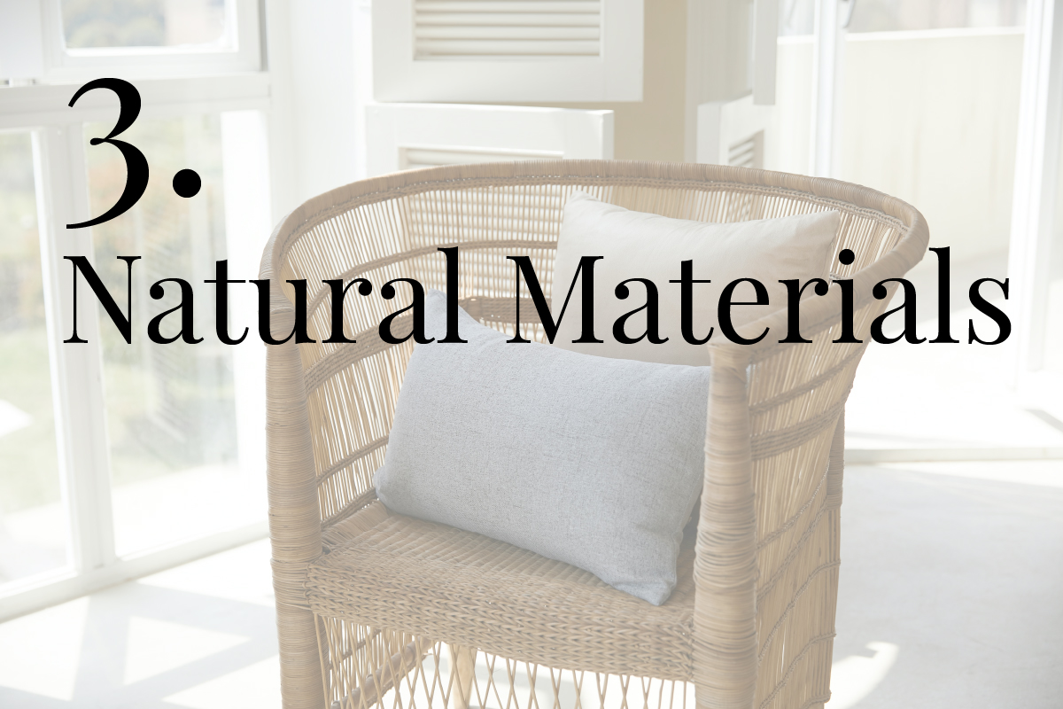 Another way to bring the outdoors in is to draw inspiration from nature in the furniture and materials you use around your house. This can include wood, glass, wicker, ceramics, shades of green, cotton/ organic fabrics.